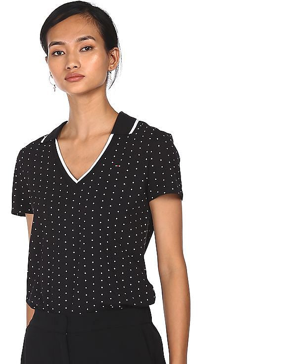 Tommy Hilfiger Women Black Polka Dot Print Notch Collar Polo Shirt